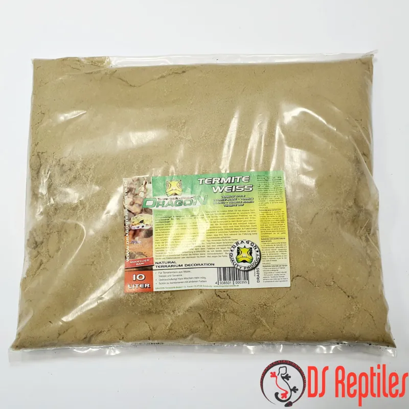 Dragon Termite Sand – 100% popoln substrat za plazilce, dvoživke, nevretenčarje in sesalce, ki radi kopajo in gradijo jame in rove. Je čisti naravni izdelek in ne vsebuje škodljivih sestavin. Na voljo je v treh privlačnih barvah – rdeči, rumeni ali beli. Tako lahko odličen substrat prilagodite opremljenosti in slogu vašega terarija. Upoštevajte, da lahko pride do manjših barvnih odstopanj, saj je substrat popolnoma naraven izdelek.