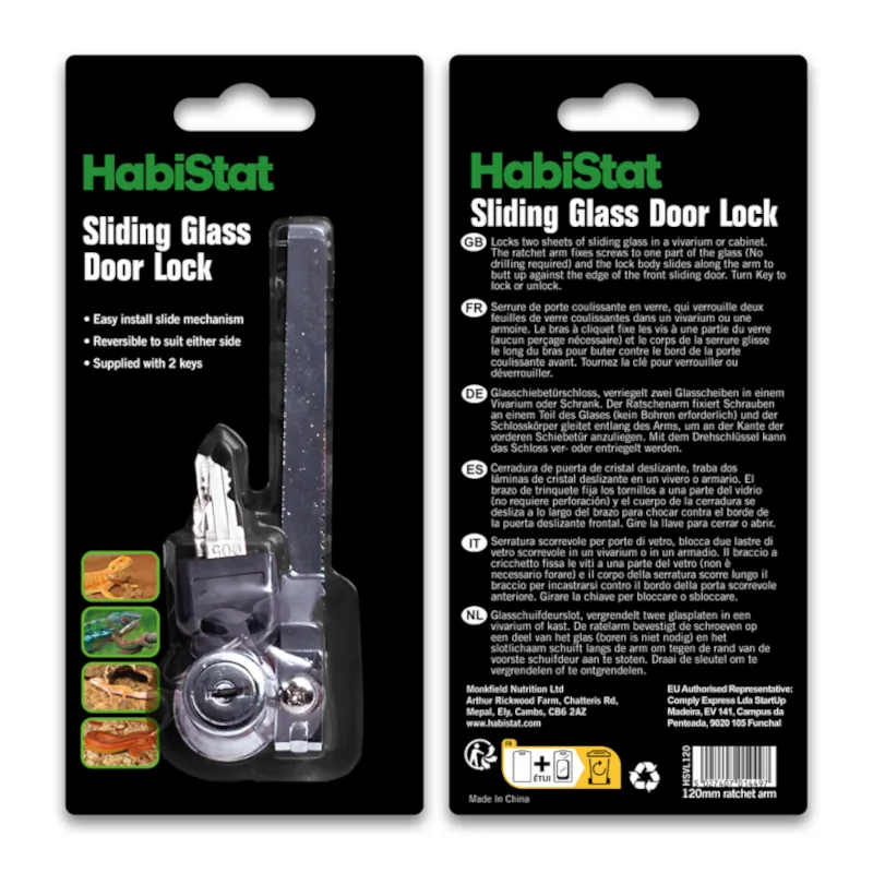 Če imate gospodinjstvo z veliko otroki ali imate doma mačke, pse – uporabite ključavnico za terarij, da bodo vsi varni. Ključavnica je pritrjena na steklo terarija in preprečuje, da bi se drsne šipe nehote odprle. Enostavna za namestitev in nudi največjo možno varnost za vas in vaše živali.