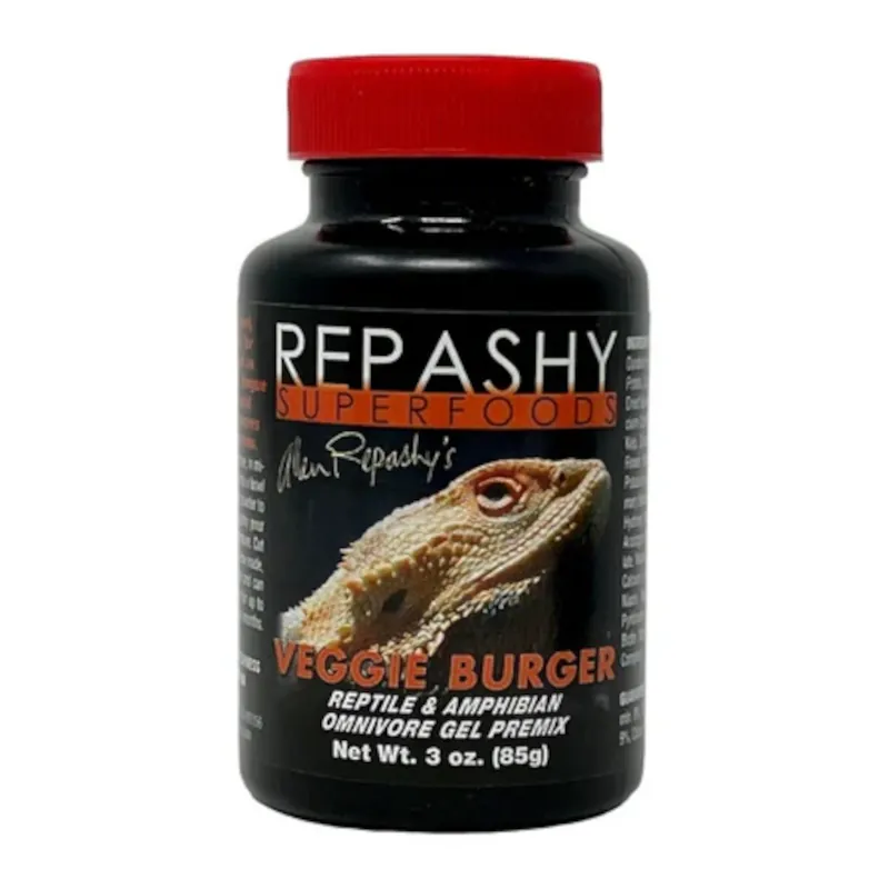 Repashy Veggie Burger – hrana z uravnoteženo stopnjo beljakovin, na osnovi zelenjave za vsejede živali, kot so bradate agame in modrojezični skinki. Hkrati jo ponudimo tudi lahko kot priboljšek za rastlinojede živali, kot so želve in legvani.