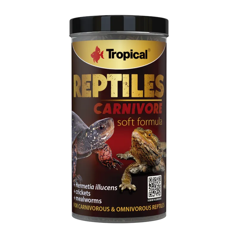 Tropical Softline Carnivore je popolna hrana za mesojede in vsejede plazilce. S sestavinami bogata hrana s suhimi mokarji in ​​suhimi črički za vsakodnevno hranjenje bradatih agam, baziliskov, vodnih agam, leopardjih gekonov, mesojedih želv in drugih žužkojedih živali.