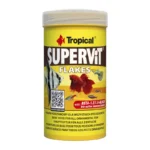 Tropical Supervit je popolna hrana za vse okrasne sladkovodne ribe, na voljo v obliki lističev ali granulata. Primerna je za vsakodnevno hranjenje. Hrana vsebuje sestavine, ki ustrezajo različnim prehranskim potrebam rib v skupnih akvarijih. Vsebuje naravni imunski stimulans beta-1,3/1,6-glukan in stabiliziran vitamin C, ki učinkovito podpira imunski sistem rib in jih ščiti pred različnimi okužbami. Celuloza in hitin izboljšujeta prebavo in preprečujeta zaprtje, karotenoidi pospešujejo razvoj barve, lecitin spodbuja vitalnost in spodbuja razmnoževanje. Zeolit prispeva k zdravemu prebavnemu sistemu in pospešuje izločanje toksinov iz telesa rib.