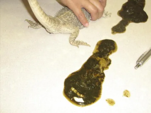 Zelen iztrebek: Določeni kuščarji zaužijejo veliko zelenjave, ki lahko včasih pusti zeleni pigment v njihovih iztrebkih. To ni razlog za preplah, še posebej, če se vasa žival obnaša dobro. Če pa ne, je vredno preveriti. Če je kakec zelen, tekoč in smrdi, lahko kaže na huda stanja, kot so bolezen jeter, anoreksija in hemolitična anemija. Če sumite, da je temu tako, se obrnite na veterinarja.
