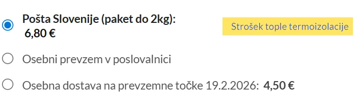 Strošek termo izolacije pri pošiljanju zamrznjene hrane se nam je tudi žal povečal (dvignila cena tako zamrznjenih gel vrečk, kakor tudi stiroporja). Velik del dviga cen tako pri topli kakor hladni termoizolaciji bomo prenesli na nas – tako da bo na vas ostal strošek 2,45€ – ne glede na količino naročila (pri naročilu žive in zamrznjene hrane se plača vsaka termoizolacija). Strošek se zaračuna samo pri kurirski dostavi, avtomatsko se sešteje s stroškom osnovne dostave: